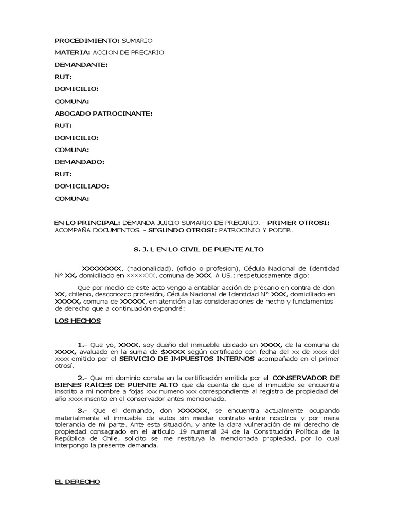 Que por medio de este acto vengo a entablar acción de precario en contra de don