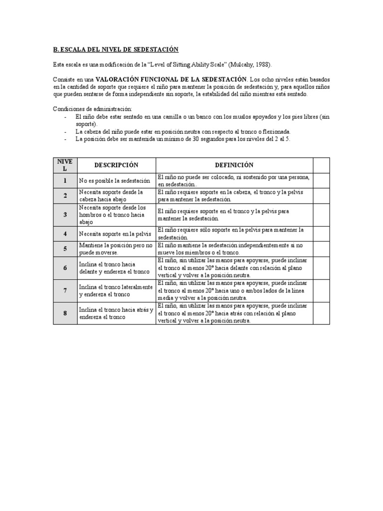 Esta escala es una modificación de la “Level of Sitting Ability Scale” (Mulcahy, 1988).