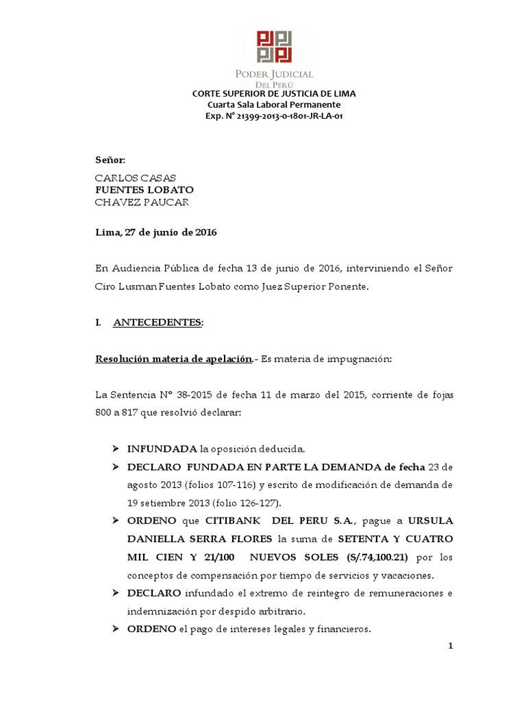 ORDENO que CITIBANK DEL PERU S.A., pague a URSULA