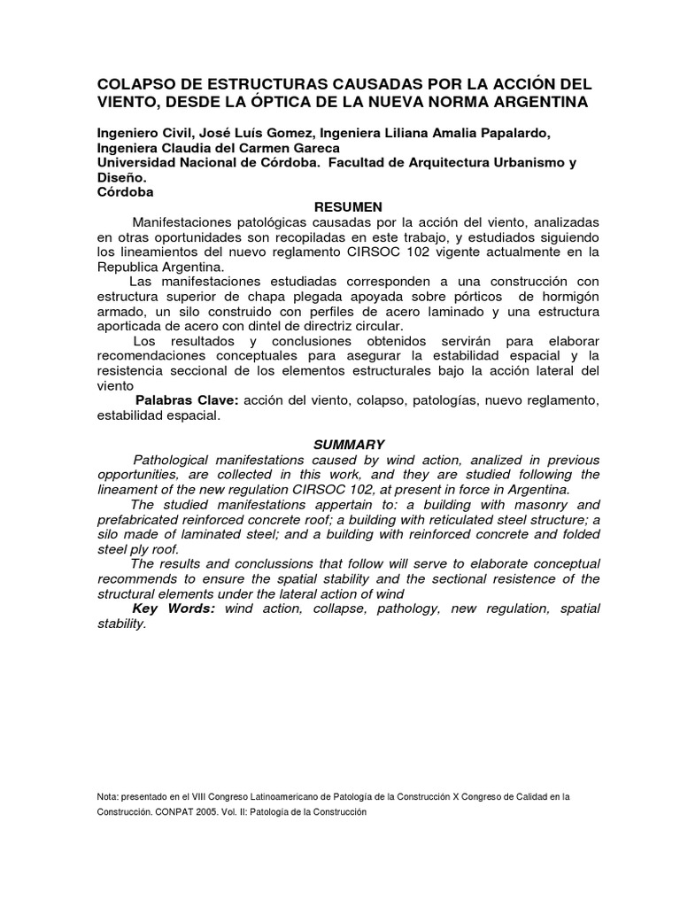 Palabras Clave: acción del viento, colapso, patologías, nuevo reglamento,