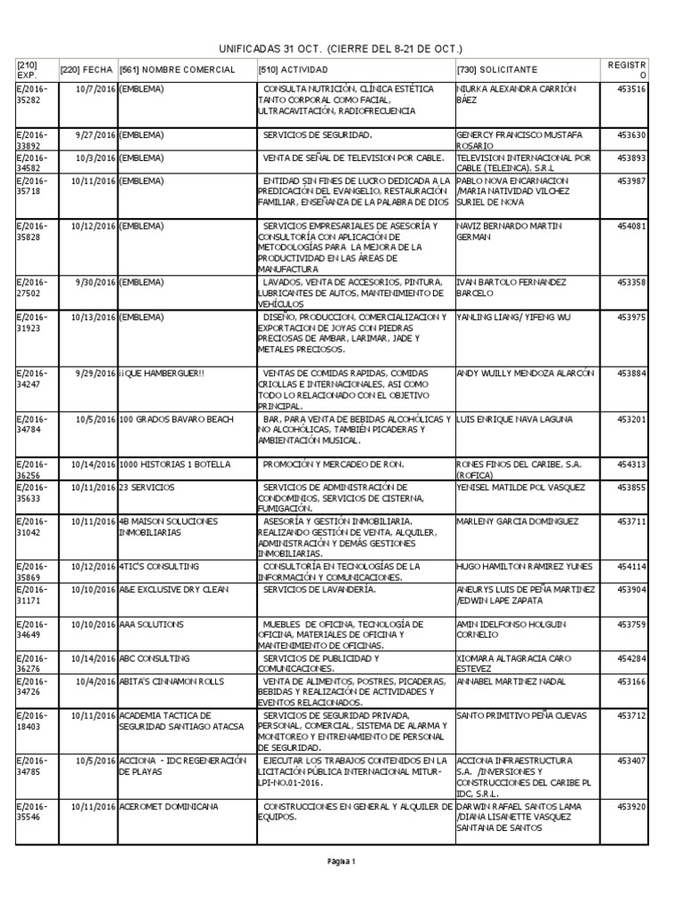 [220] FECHA [561] NOMBRE COMERCIAL [510] ACTIVIDAD [730] SOLICITANTE
