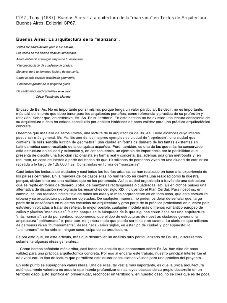 DÍAZ, Tony. (1987): Buenos Aires: La arquitectura de la “manzana” en Textos de Arquitectura.