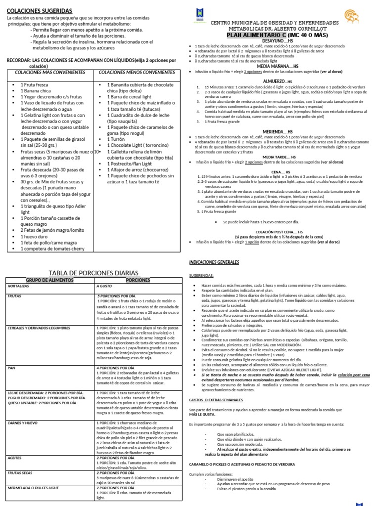 - Ayuda a disminuir el tamaño de las porciones. PLAN ALIMENTARIO C (IMC 40 O MÁS)
