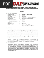 La asignatura de Química Orgánica pertenece al área de formación general, es de naturaleza teórico-