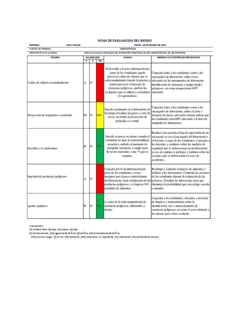 (NR) Nivel de riesgo: (T) trivial, (TO) tolerable, (MO) moderado, (I) importante, (IN) intolerable, (PE) pendiente de evaluar.