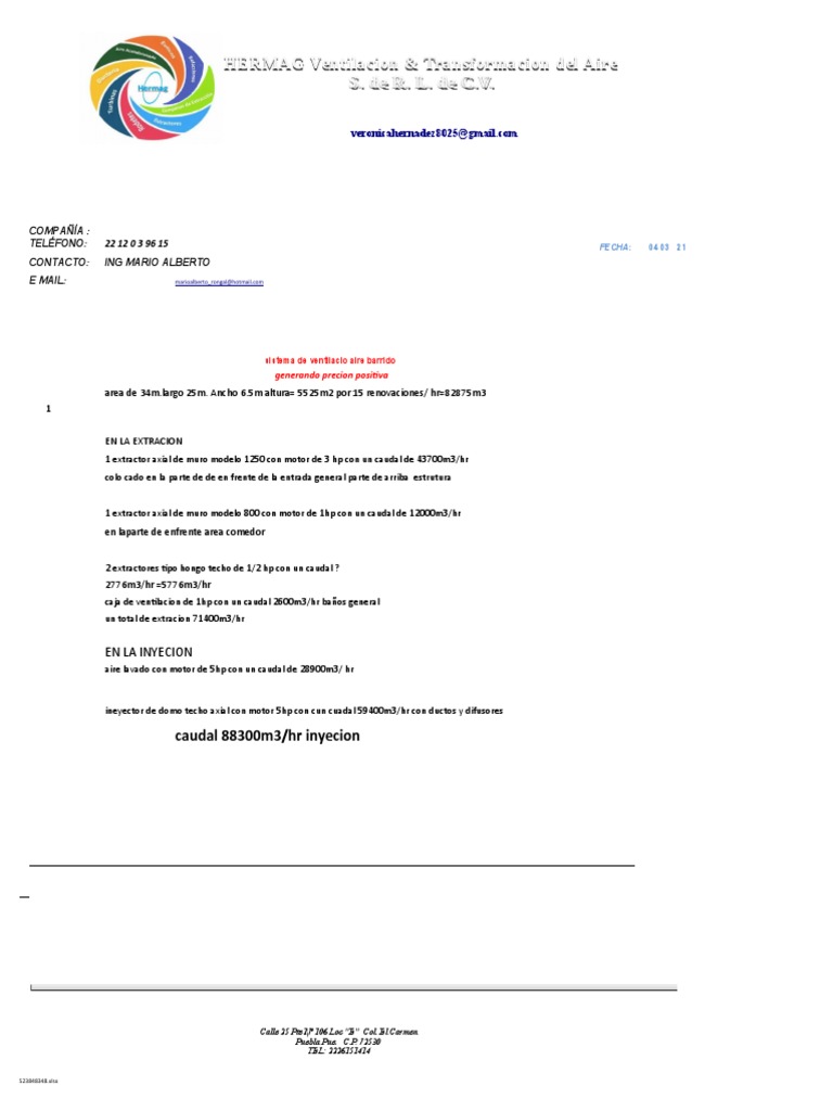 area de 34m.largo 25m. Ancho 6.5m altura= 5525m2 por 15 renovaciones/ hr=82875m3