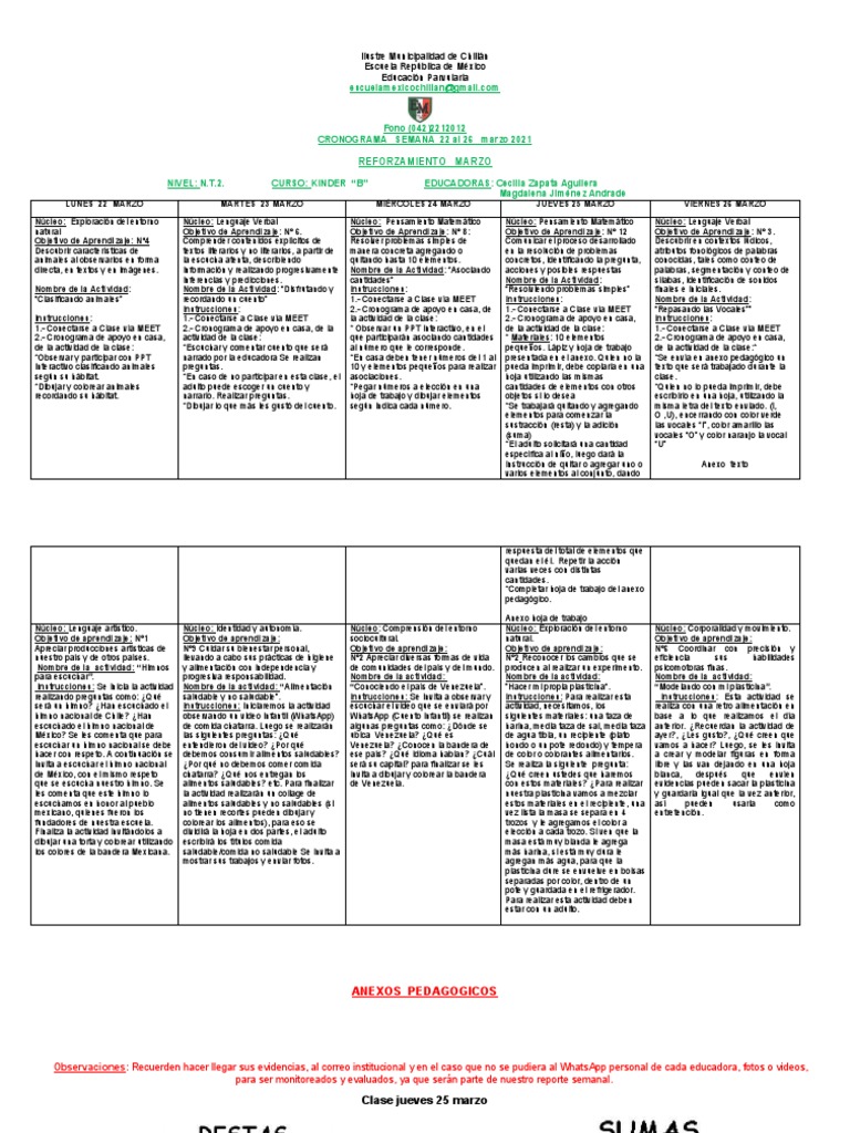 Observaciones: Recuerden hacer llegar sus evidencias, al correo institucional y en el caso que no se pudiera al WhatsApp personal de cada educadora, fotos o videos,