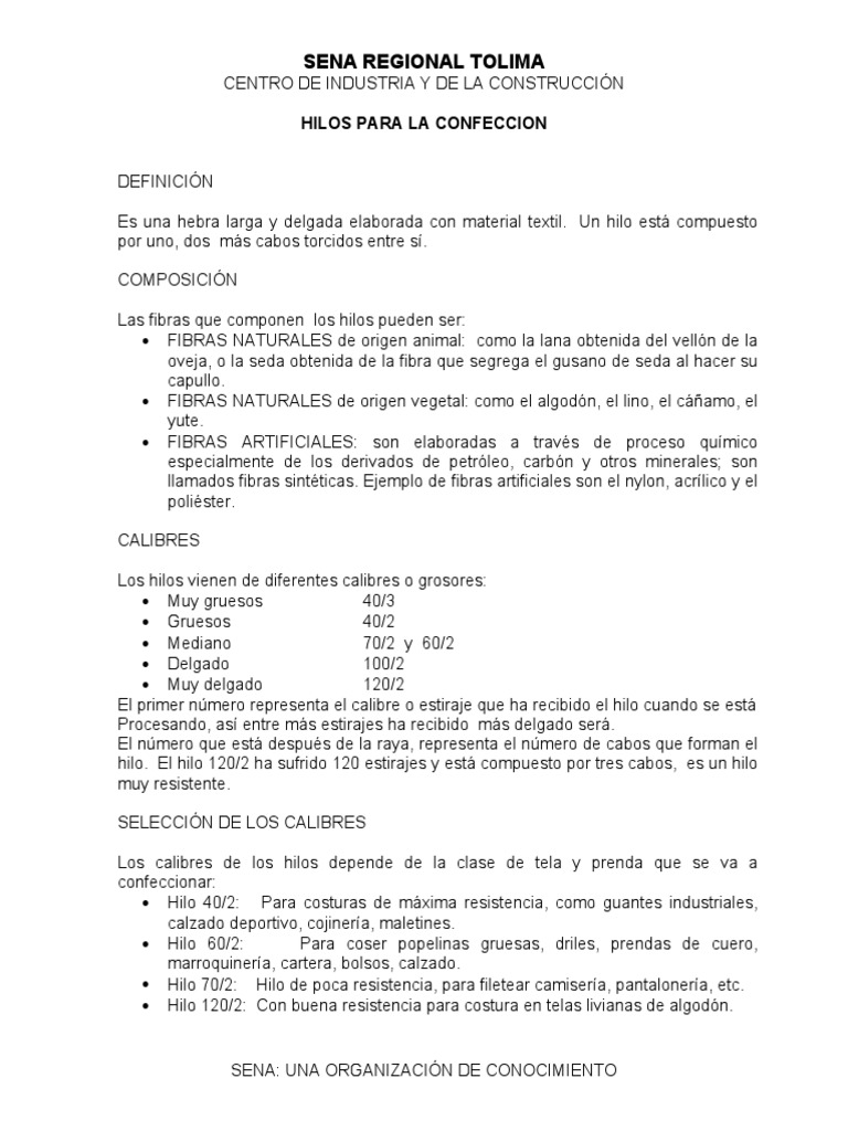 Los calibres de los hilos depende de la clase de tela y prenda que se va a
