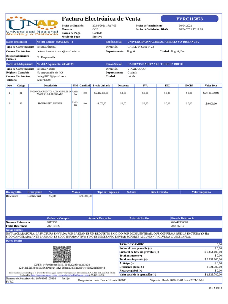 Moneda COP Fecha de Validación DIAN 20/04/2021 [Link]