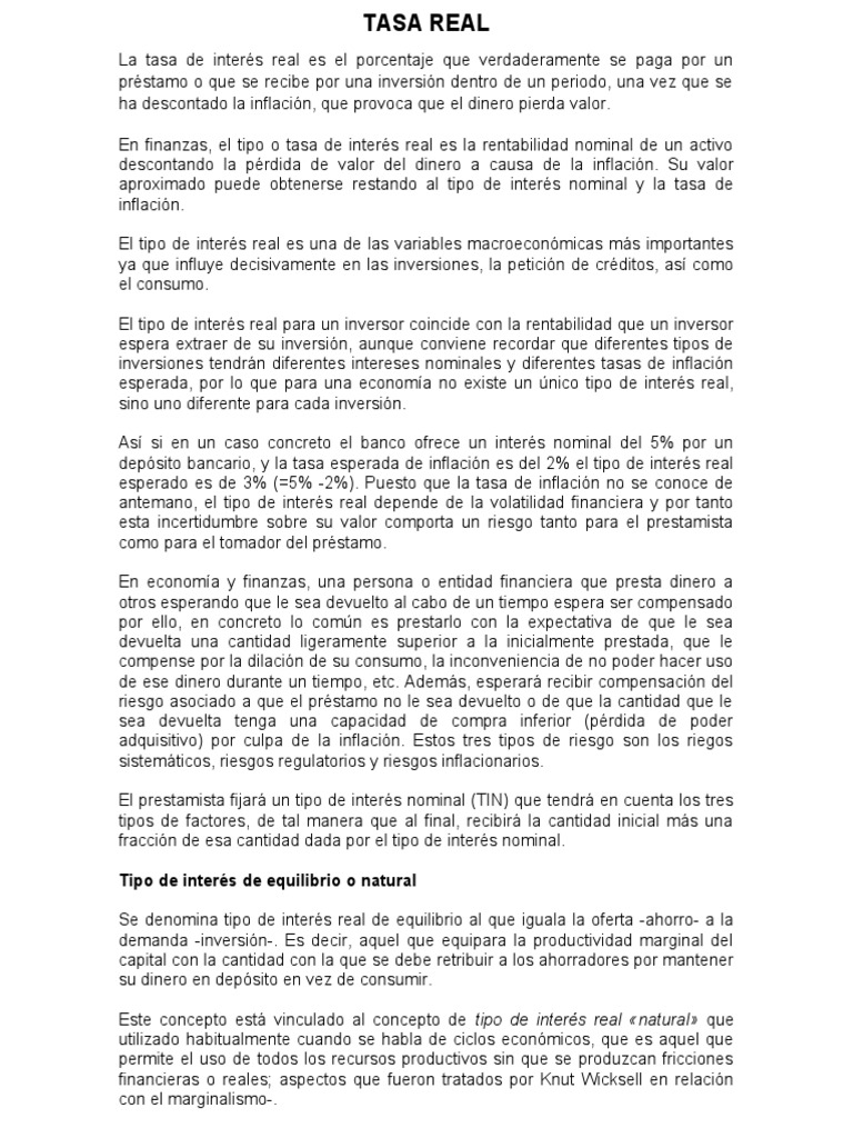 intereses. El tipo de interés real se obtiene restando la tasa de inflación del tipo de