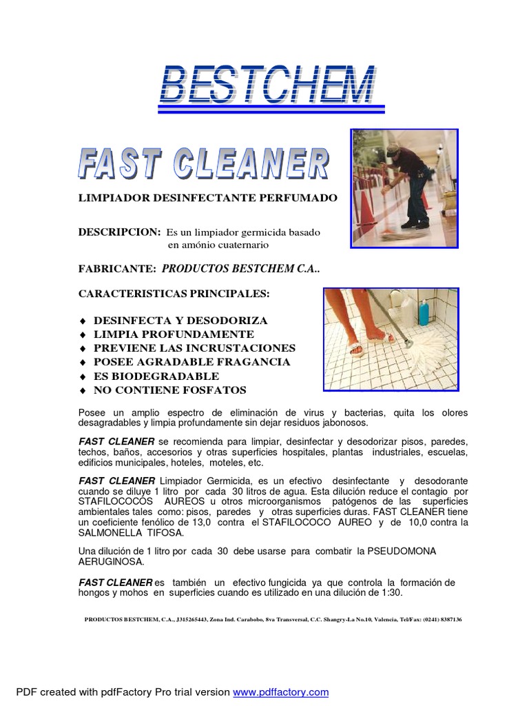 ambientales tales como: pisos, paredes y otras superficies duras. FAST CLEANER tiene