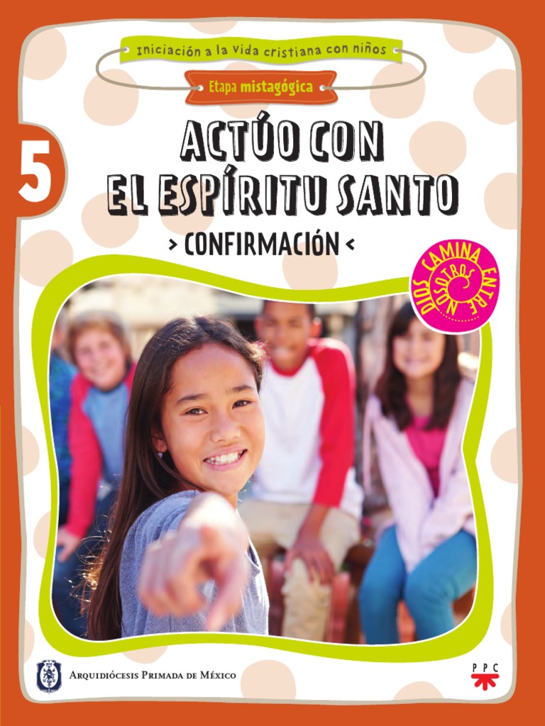 Este documento presenta el quinto libro de la serie de catequesis "Dios camina entre nosotros" dirigida a niños. El libro se titula "Actúo con el Espíritu Santo" y corresponde a la tercera etapa del proceso de iniciación cristiana conocida como etapa mistagógica. El libro busca guiar a los niños a actuar con la fuerza del Espíritu Santo y prepararlos para el sacramento de la Confirmación. El documento incluye una introducción del Cardenal Carlos Aguiar Retes sobre la