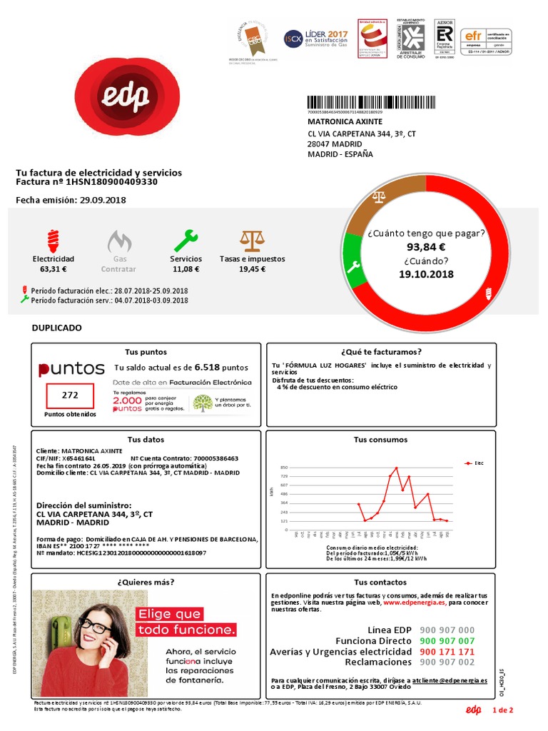 Factura electricidad y servicios nº 1HSN180900409330 por valor de 93,84 euros (Total Base Imponible: 77,55 euros - Total IVA: 16,29 euros) emitida por EDP ENERGÍA, S.A.U.