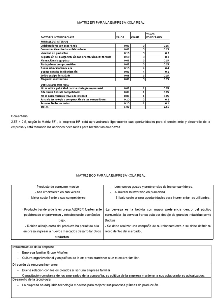 1. La matriz EFI nos arroja un valor de 2.55, que está por encima del promedio de 2.5, lo que nos indica que es una empresa que tiene