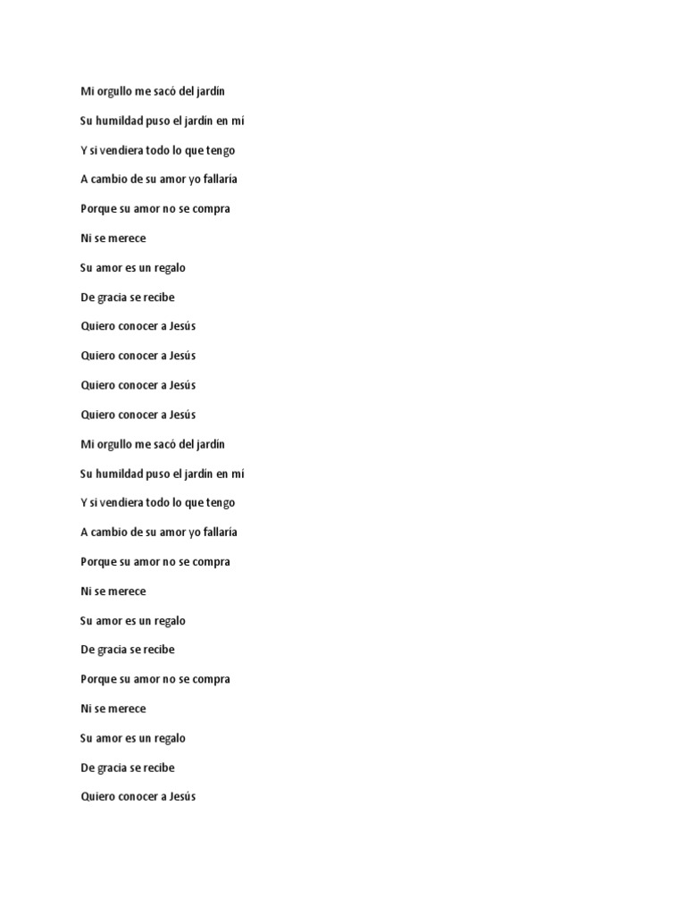 El documento habla sobre el amor de Jesús y el deseo de conocerlo. Expresa que el orgullo aleja a uno de Dios, mientras que su humildad trae el jardín de Dios dentro. También dice que el amor de Jesús es un regalo que no se puede comprar o merecer, solo recibir por gracia. El tema principal es la necesidad de conocer a Jesús y ser hallado en él.
