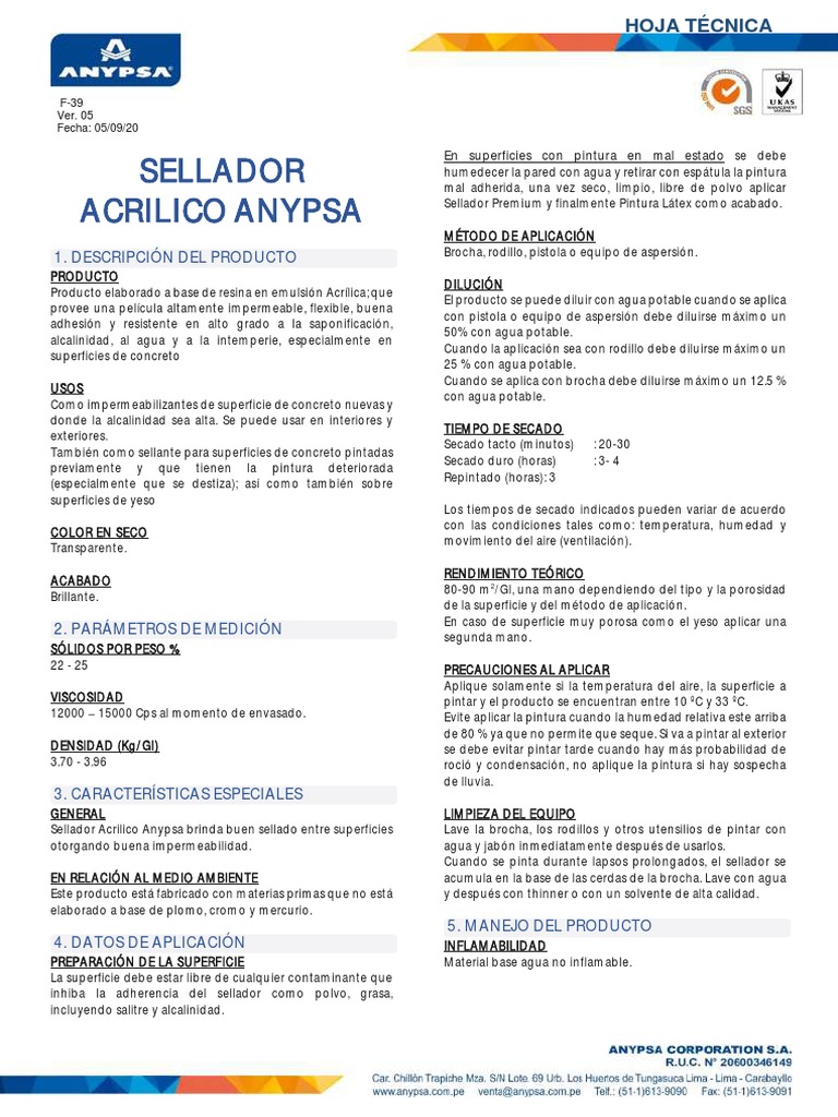 Sellador Acrilico Anypsa brinda buen sellado entre superficies Lave la brocha, los rodillos y otros utensilios de pintar con