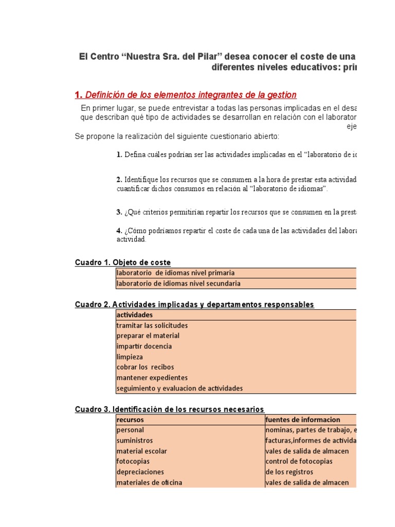 Una vez que el Centro Nuestra Sra. del Pilar ha definido los elementos del sistema de coste