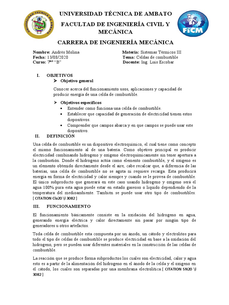 Fecha: 13/08/2020 Tema: Celdas de combustible