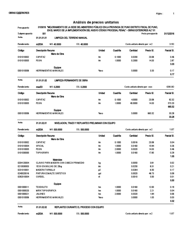 Código Descripción Recurso Unidad Cuadrilla Cantidad Precio S/. Parcial S/.