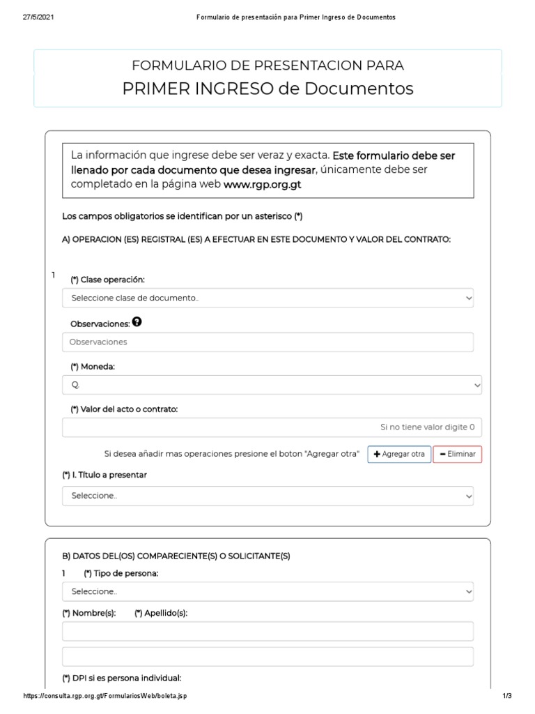 27/5/2021 Formulario de presentación para Primer Ingreso de Documentos