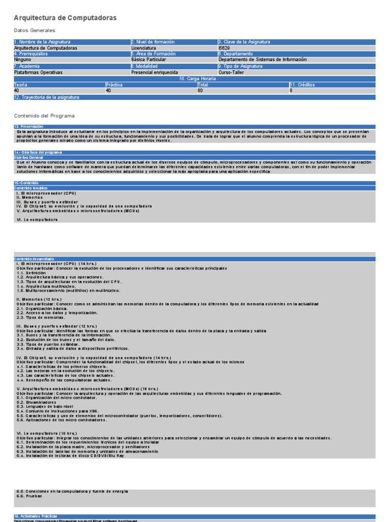 Esta asignatura introduce al estudiante en los principios en la implementación de la organización y arquitectura de los compu tadores actuales. Los conceptos que se presentan