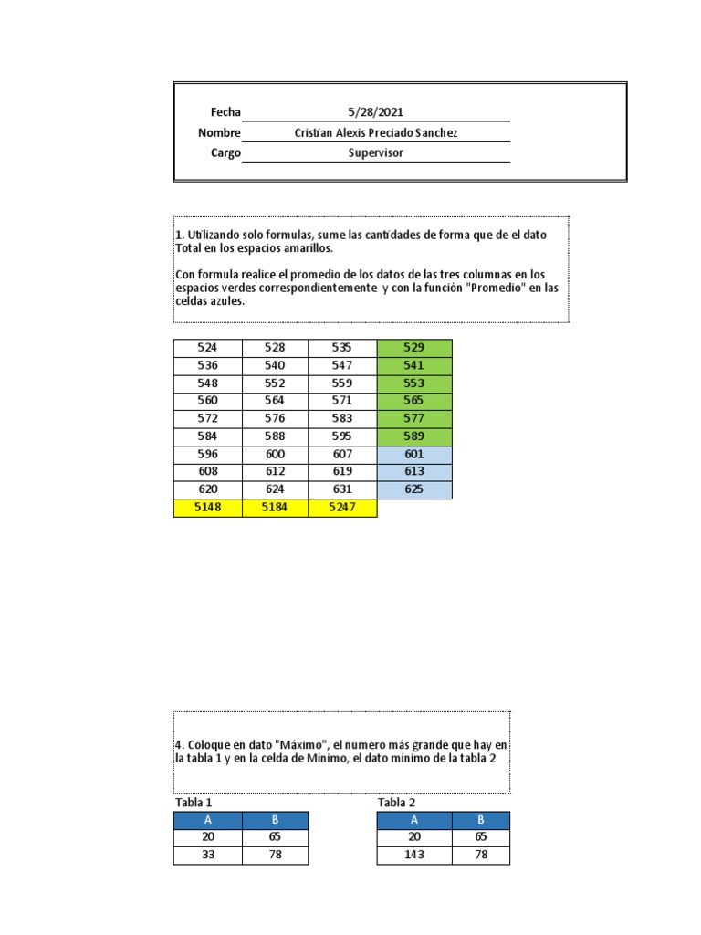 Nota: para todo debe usar formulas y estas se deben ver reflejadas en los cuadros