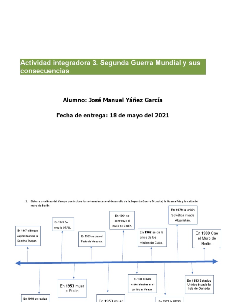 1. Elabora una línea del tiempo que incluya los antecedentes y el desarrollo de la Segunda Guerra Mundial, la Guerra Fría y la caída del