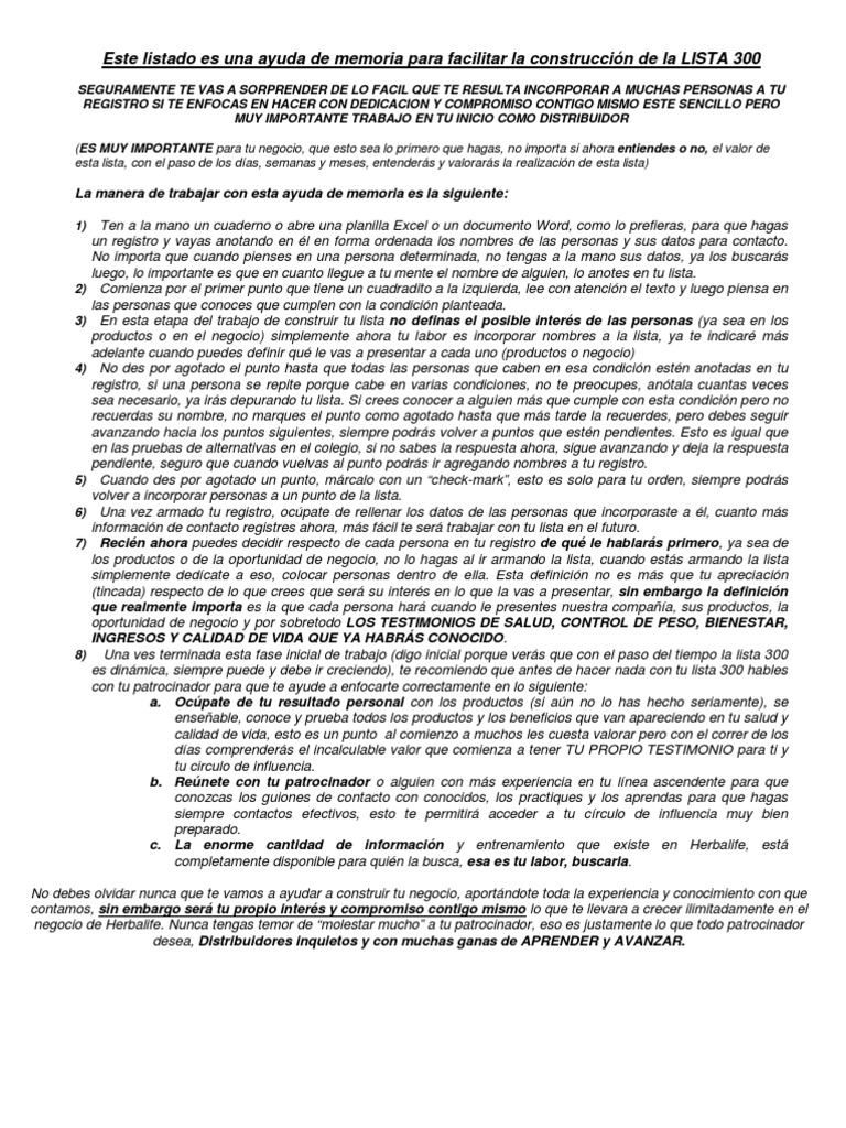 Este listado es una ayuda de memoria para facilitar la construcción de la LISTA 300