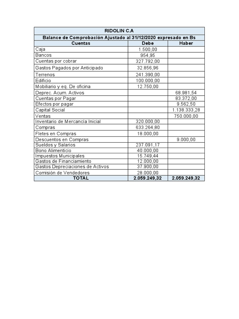 Balance de Comprobación Ajustado al 31/12/2020 expresado en Bs