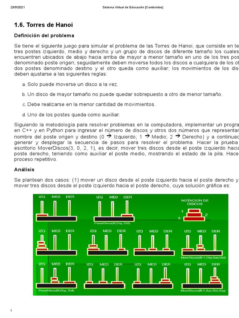 Se tiene el siguiente juego para simular el problema de las Torres de Hanoi, que consiste en te
