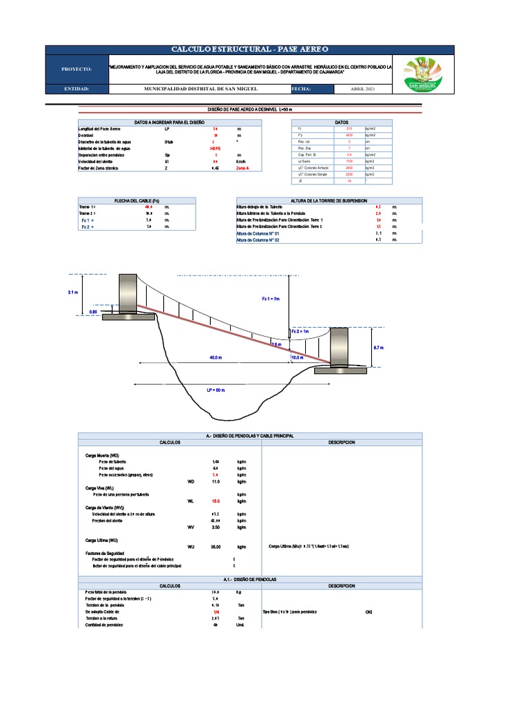 NOTA: SE DEBE EVALUAR QUE LA TUBERÍA NO QUEDE POR DEBAJO DE LA CATENARIA DEL CABLE PRINCIPAL