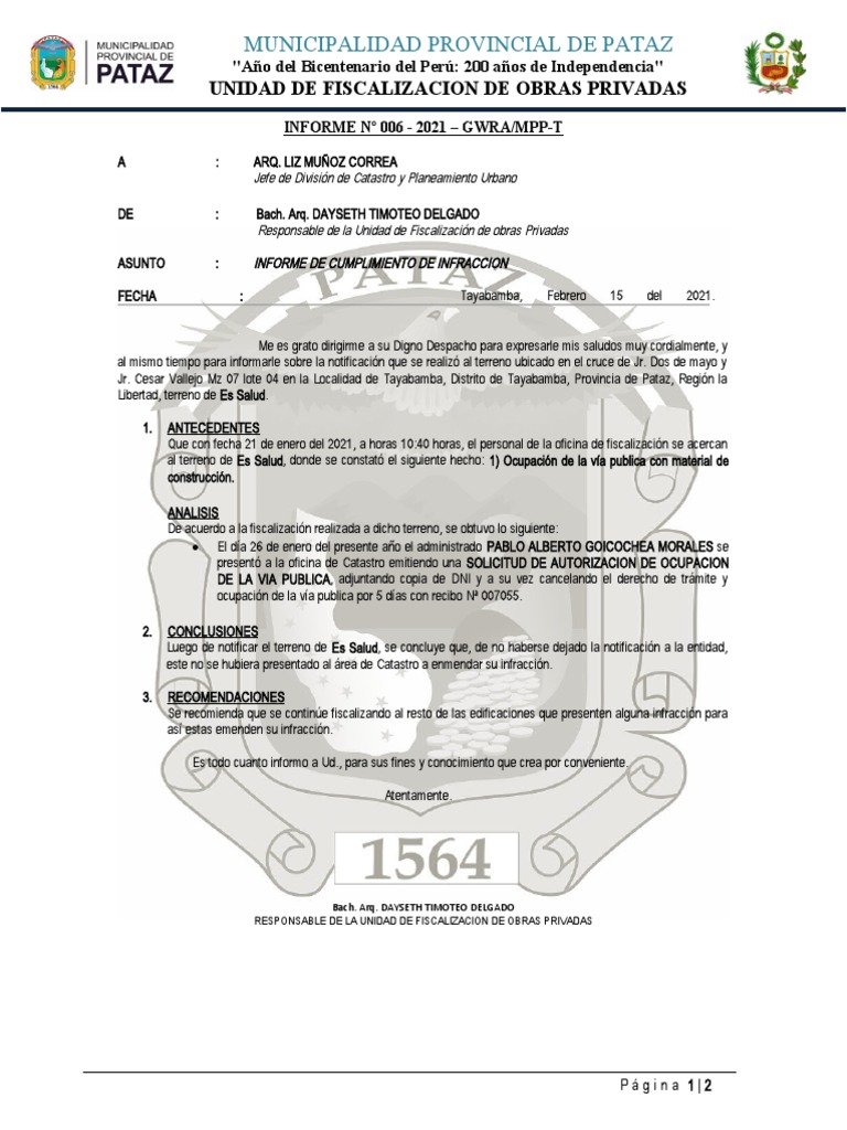 al mismo tiempo para informarle sobre la notificación que se realizó al terreno ubicado en el cruce de Jr. Dos de mayo y