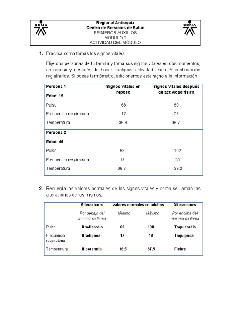 Elije dos personas de tu familia y toma sus signos vitales en dos momentos;