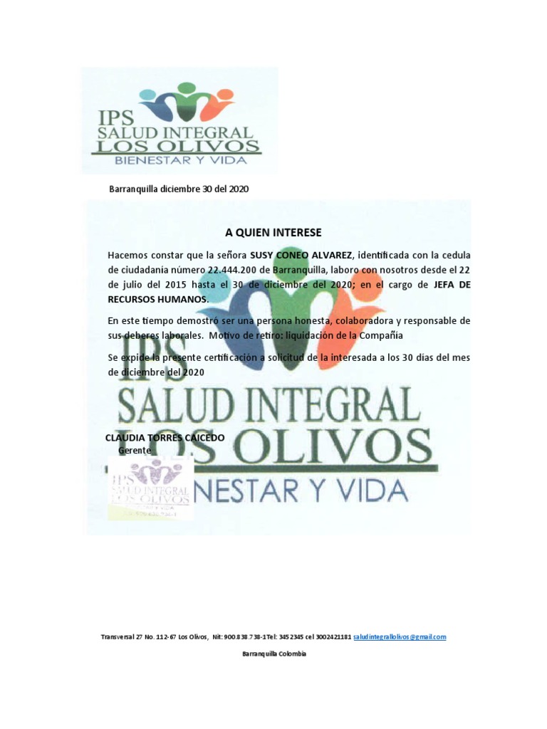 Transversal 27 No. 112-67 Los Olivos, Nit: 900.838.738-1Tel: 3452345 cel 3002421181 saludintegrallolivos@[Link]