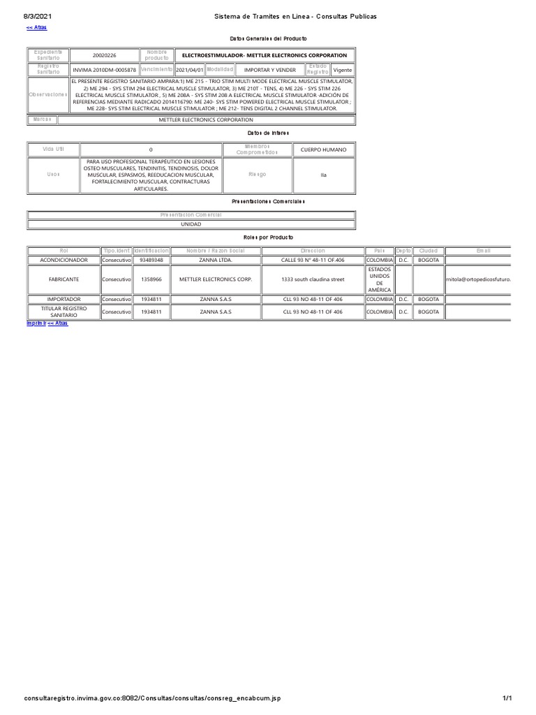 FABRICANTE Consecutivo 1358966 METTLER ELECTRONICS CORP. 1333 south claudina street rnitola@ortopedicosfuturo.