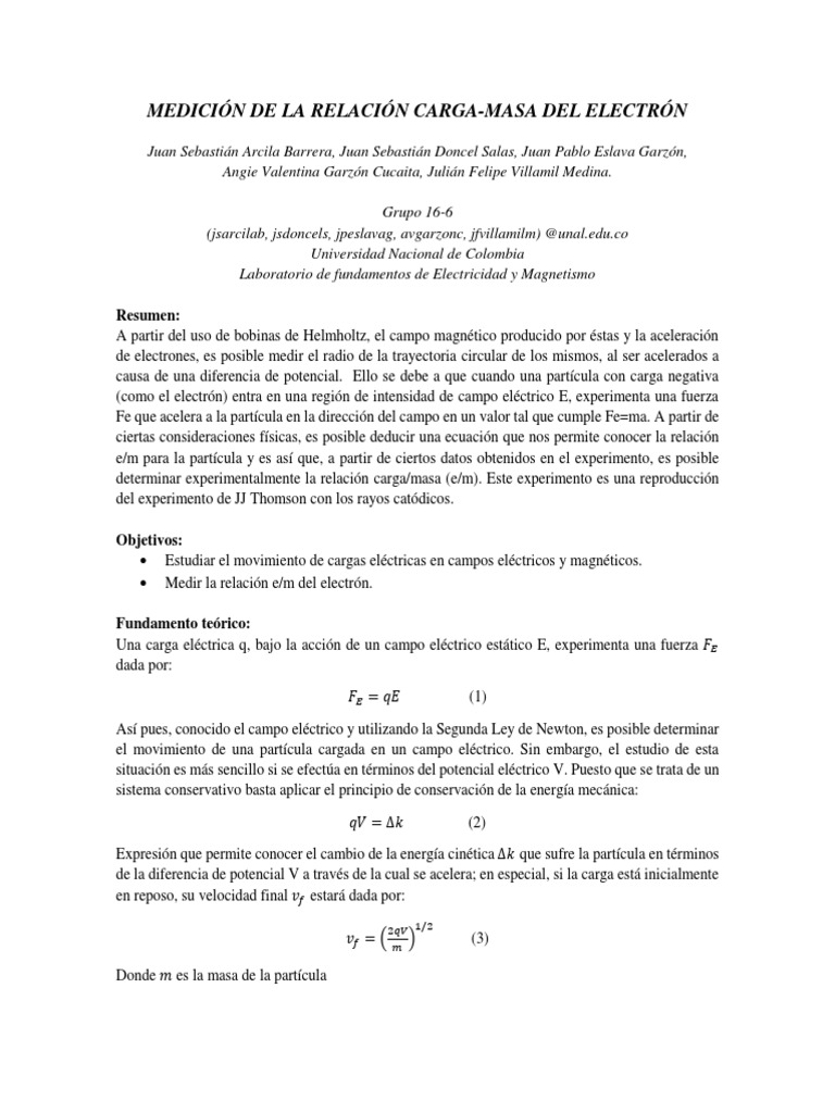 e/m para la partícula y es así que, a partir de ciertos datos obtenidos en el experimento, es posible