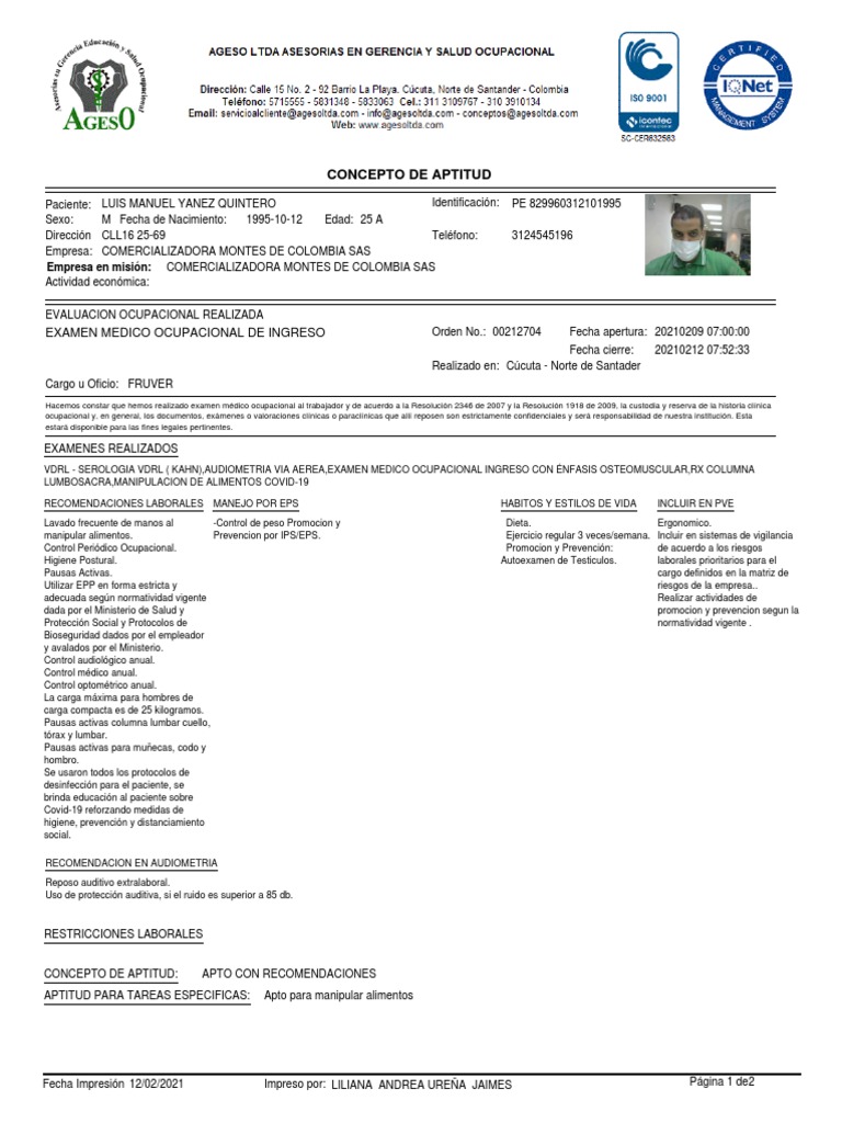 EXAMEN MEDICO OCUPACIONAL DE INGRESO Orden No.: 00212704 Fecha apertura: 20210209 [Link]