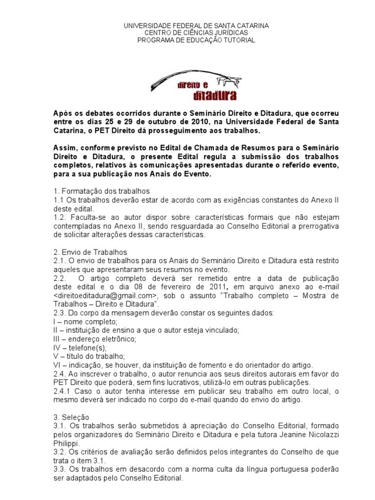 2.1. O envio de trabalhos para os Anais do Seminário Direito e Ditadura está restrito