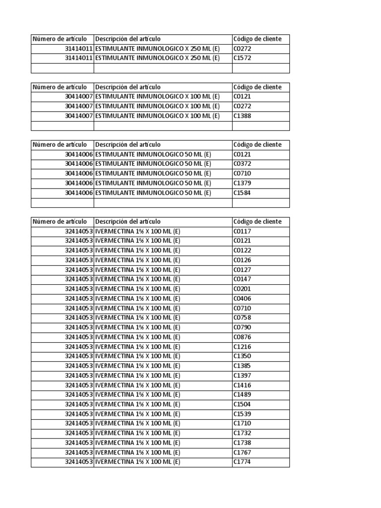 El documento contiene una lista de artículos médicos veterinarios con sus números, descripciones y códigos de clientes. Se enumeran varios estimulantes inmunológicos, ivermectina, hierro dextrano B12 y calcio con diferentes volúmenes de envase asociados a múltiples códigos de clientes.
