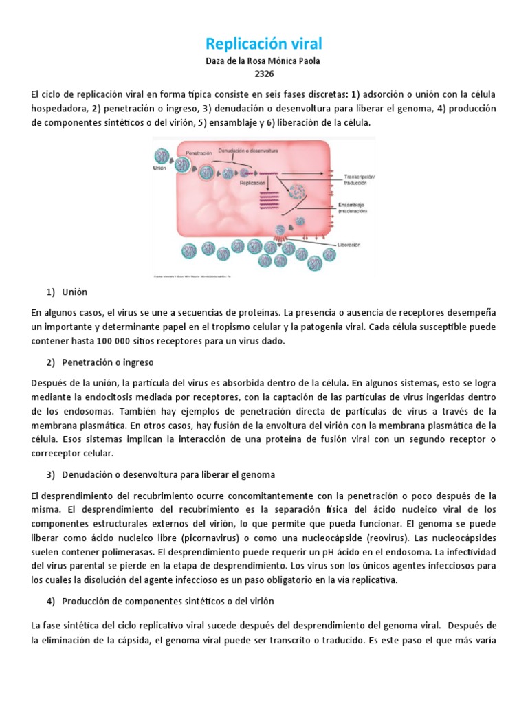 El ciclo de replicación viral en forma típica consiste en seis fases discretas: 1) adsorción o unión con la célula