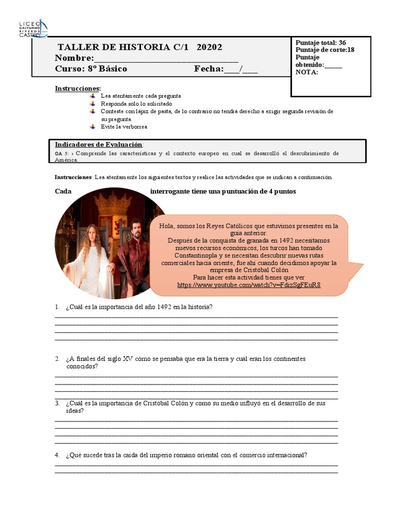 TALLER DE HISTORIA C/1 20202 Puntaje de corte:18