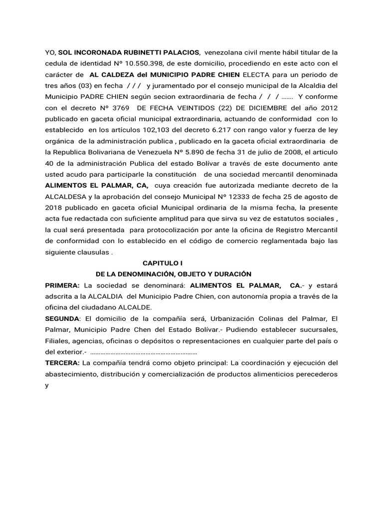 PRIMERA: La sociedad se denominará: ALIMENTOS EL PALMAR, CA.- y estará