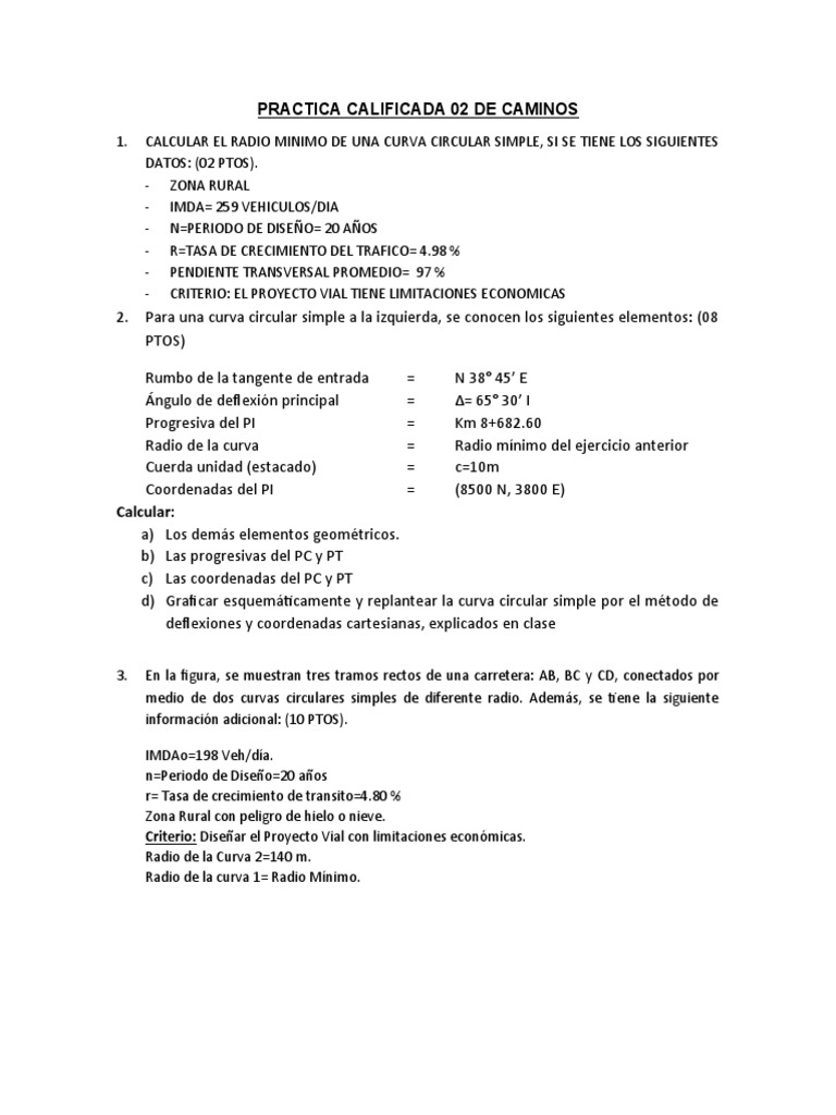 1. CALCULAR EL RADIO MINIMO DE UNA CURVA CIRCULAR SIMPLE, SI SE TIENE LOS SIGUIENTES
