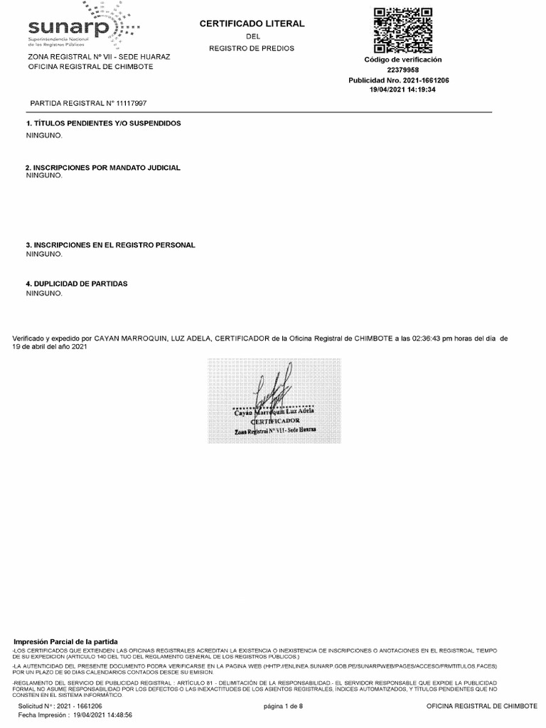 Solicitud N° : 2021 - 1661206 página 8 de 8 OFICINA REGISTRAL DE CHIMBOTE