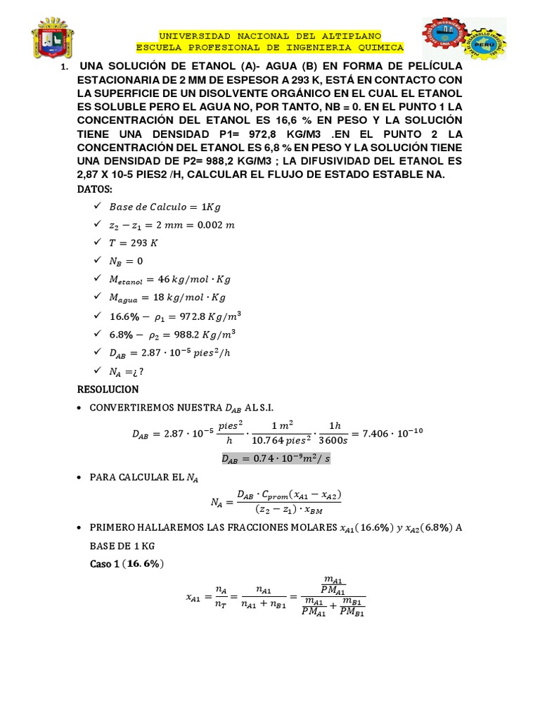 UNA DENSIDAD DE Ρ2= 988,2 KG/M3 ; LA DIFUSIVIDAD DEL ETANOL ES