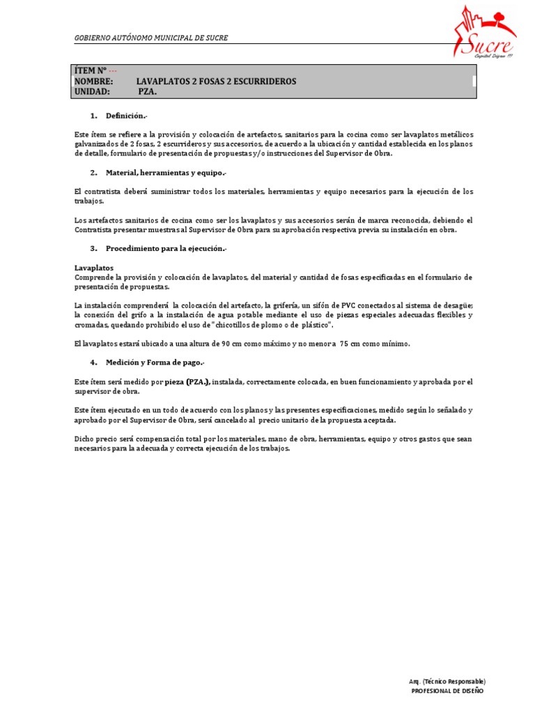 Comprende la provisió n y colocació n de lavaplatos, del material y cantidad de fosas especificadas en el formulario de