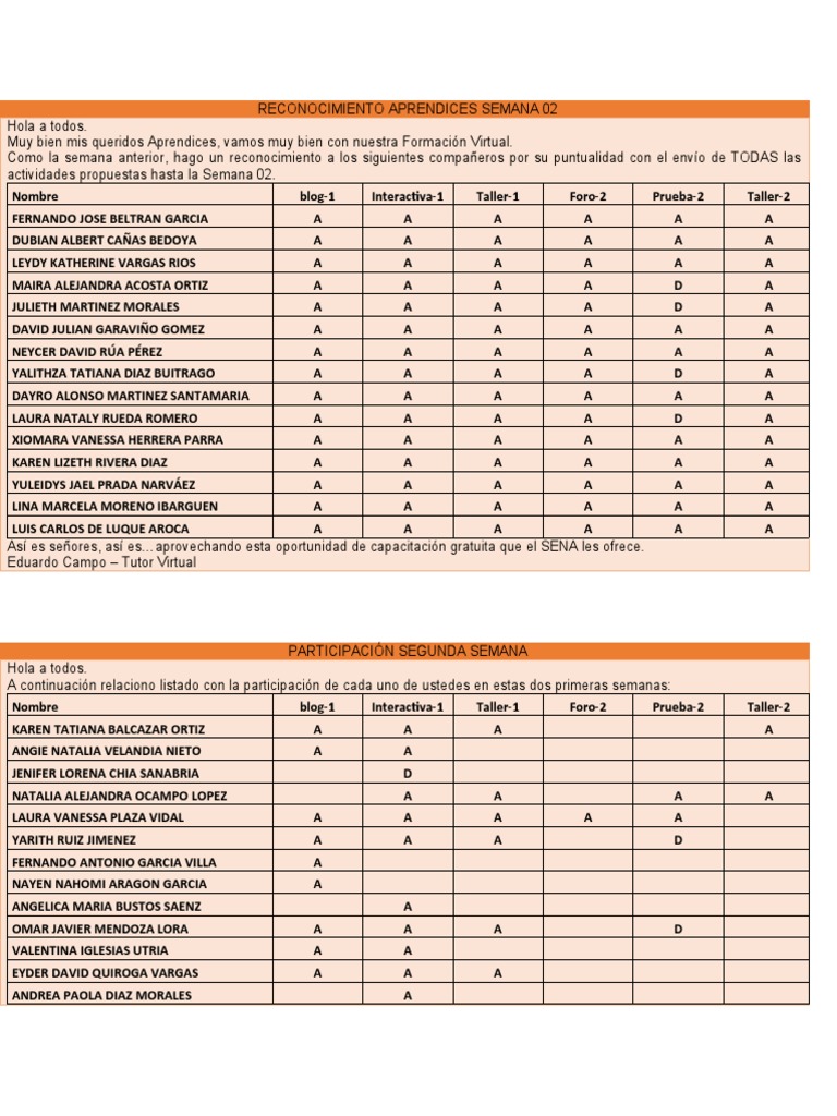 A continuación relaciono listado con la participación de cada uno de ustedes en estas dos primeras semanas: