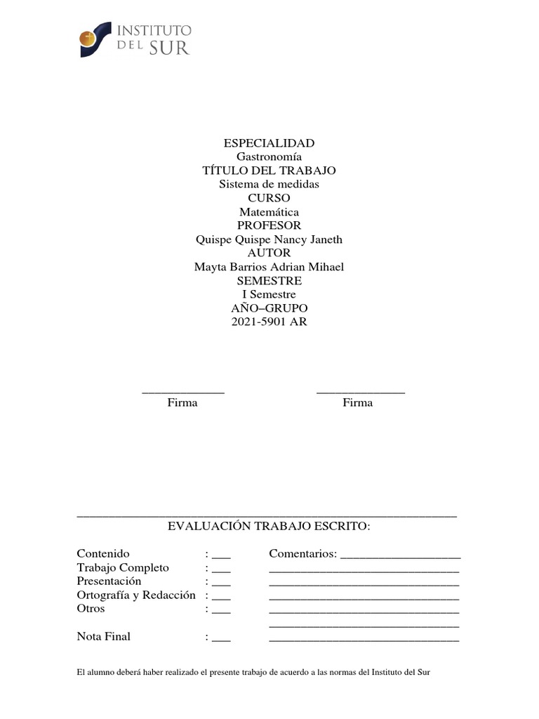 El alumno deberá haber realizado el presente trabajo de acuerdo a las normas del Instituto del Sur