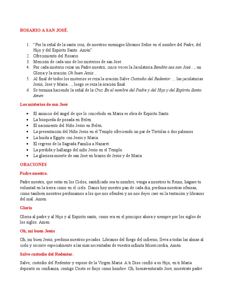 4. Por cada misterio rezar un Padre nuestro, cinco veces la Jaculatoria Bendito sea san José…, un