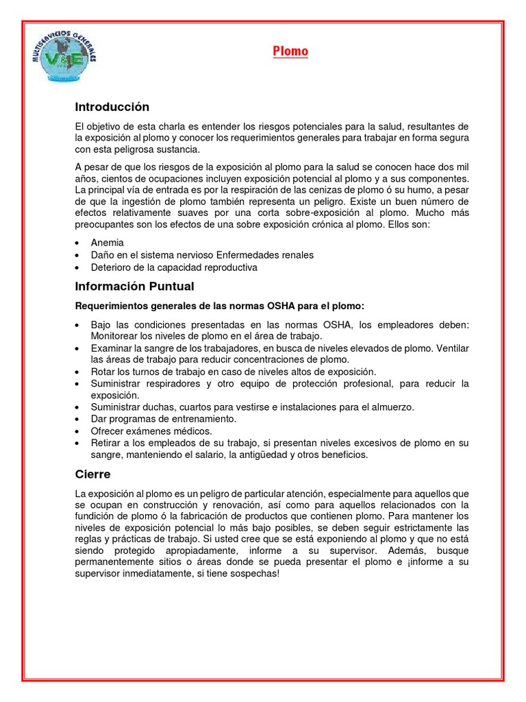 la exposición al plomo y conocer los requerimientos generales para trabajar en forma segura